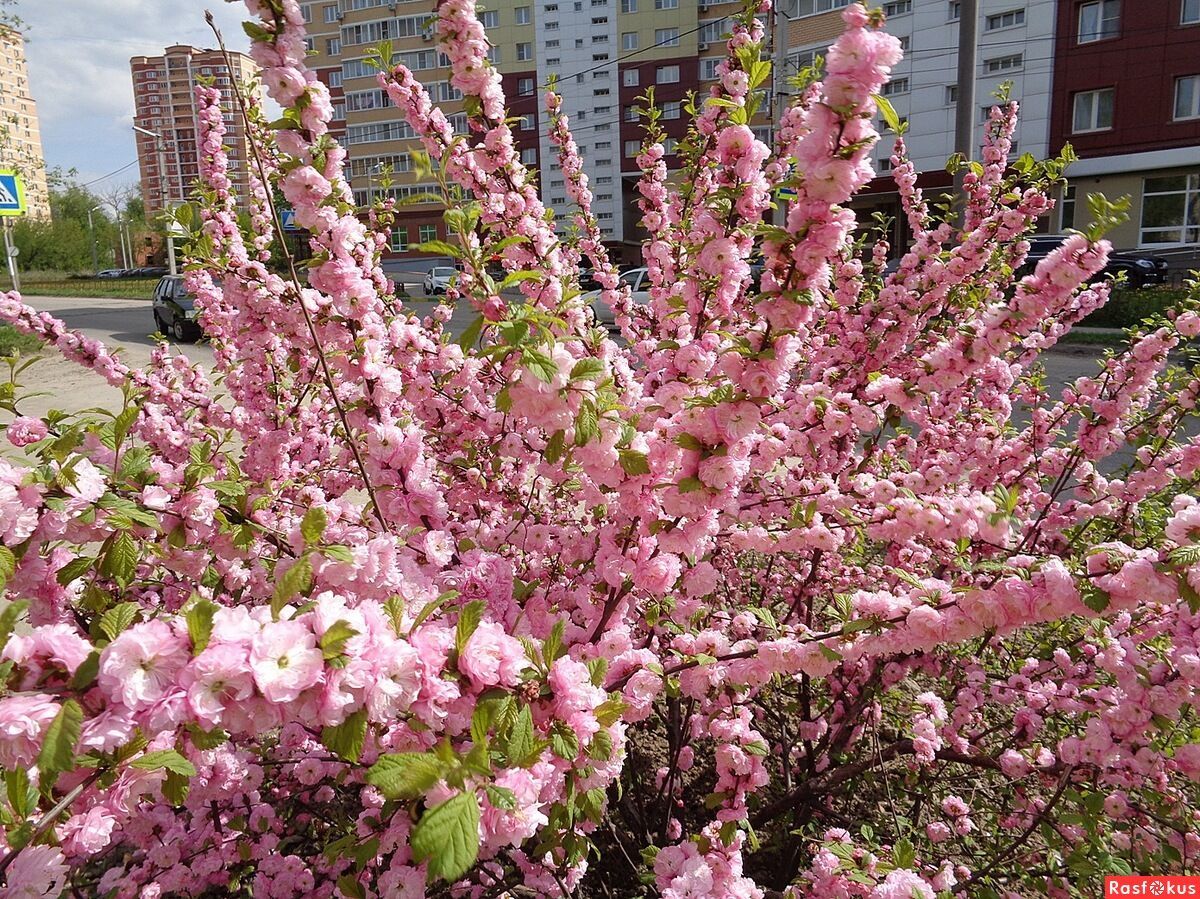 - Миндаль трехлопастный – «Киевская». Данный сорт луизиании характеризуется большим размером кустарника. Деревце достигает высоты 3,5 метров. Цветки немного темнее, в отличие от предыдущего вида, но также имеют розовый оттенок. Цветки диаметром 35 мм имеют около 10-12 лепестков и 10 чашелистиков. Цветоножка достигает в длину 7 мм. В конце апреля – начале мая начинается цветение этого растения. Оно проходит очень красочно и обильно, и продолжается на протяжении 7 дней. В это время вблизи кустарника распространяется невероятно приятный миндальный аромат. Раскрытие цветков на побегах происходит до распускания листьев, посему «Киевская» выглядит более эффектно и ярко, нежели «Плена».